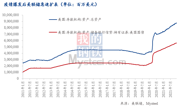 以美國為例。貨幣政策方面,短短一年時間,美聯(lián)儲向市場投放了23萬億美元,美聯(lián)儲資產(chǎn)負(fù)債表急劇擴(kuò)張。大量的熱錢涌入各個領(lǐng)域,導(dǎo)致美元大幅貶值,全球大宗商品價格猛漲。