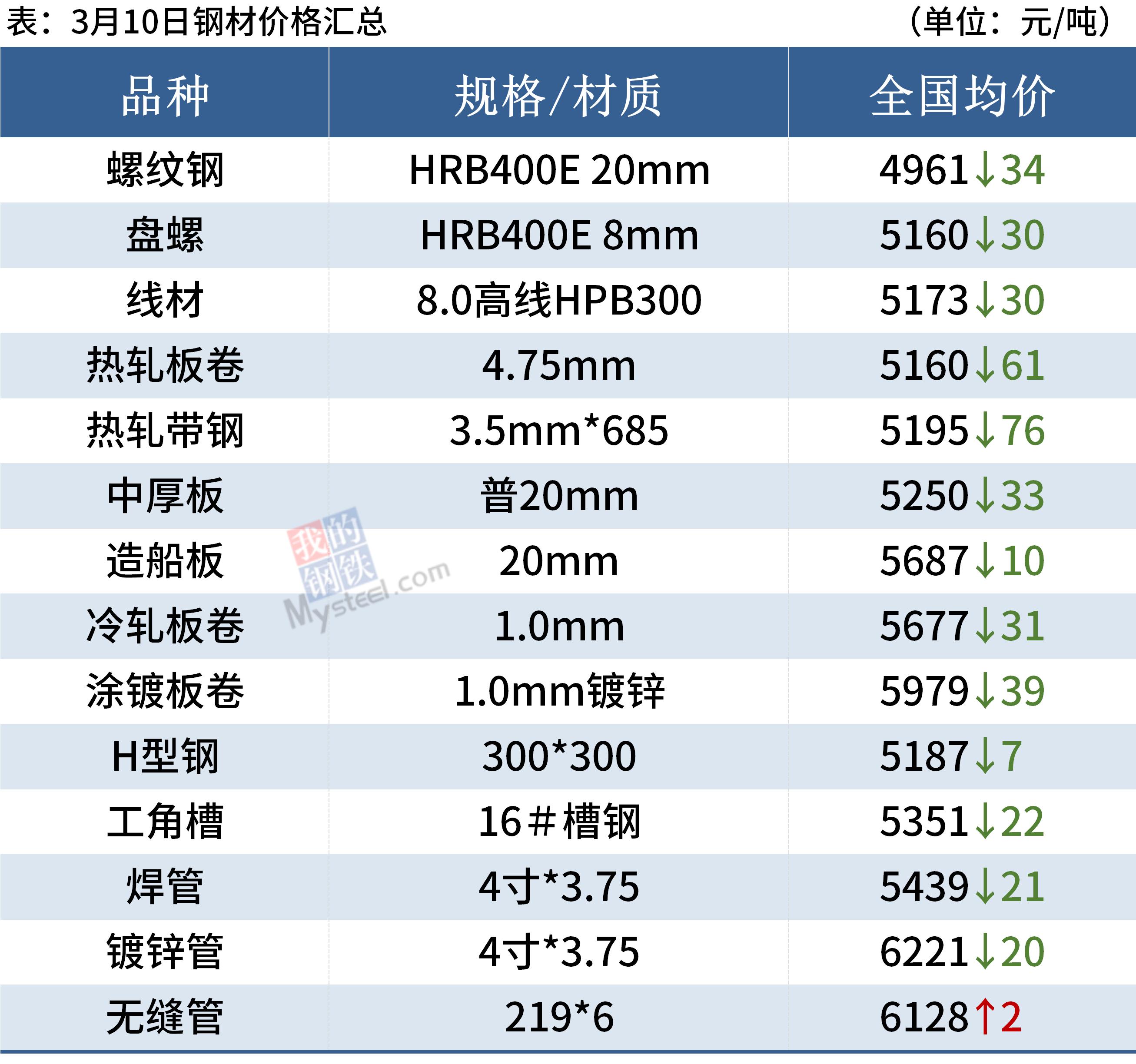 3月10日,國內鋼材市場普遍下跌,唐山普方坯出廠價下跌40報4720元/噸。9日國際原油、有色金屬價格大幅下跌,導致10日早盤國內黑色商品期貨市場大幅低開,午后跌勢收窄,低位成交較好。