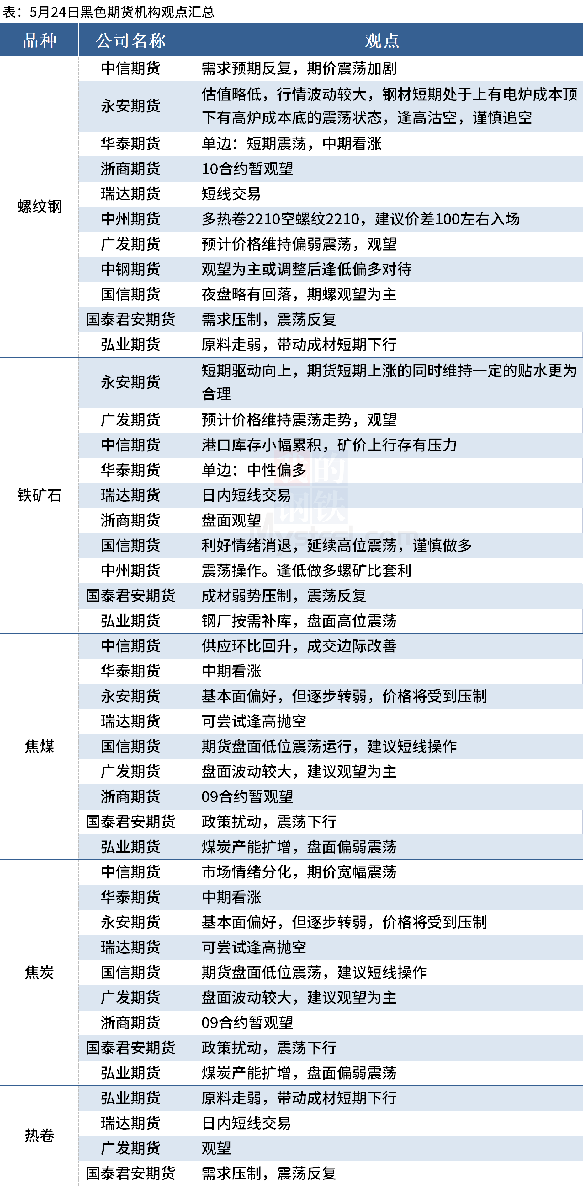據Mysteel統計5月24日11家期貨機構操作策略,其中多數機構建議螺紋鋼觀望為主,預計鐵礦石延續震蕩,焦煤、焦炭偏弱震蕩。具體匯總內容如下: