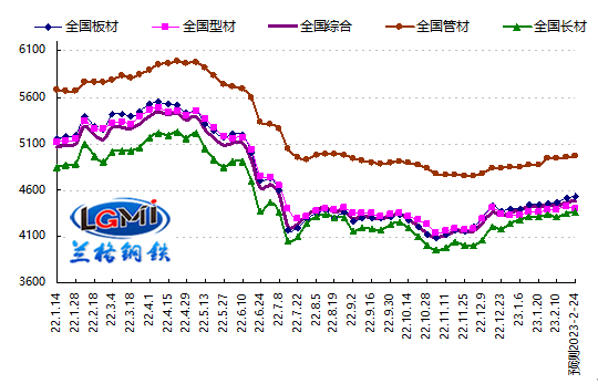 2023年第7周(2023.2.13-2.17)蘭格鋼鐵全國絕對價格指數為4471元,較上周上升0.8%,較去年同期下降14.0%。其中,蘭格鋼鐵長材絕對價格指數為4348元,較上周上升0.7%,較去年同期下降12.7%;蘭格鋼鐵型材絕對價格指數為4424元,較上周上升0.8%,較去年同期下降16.2%;蘭格鋼鐵板材絕對價格指數為4509元,較上周上升1.0%,較去年同期下降14.7%;蘭格鋼鐵管材絕對價格指數為4949元,較上周上升0.1%,較去年同期下降14.0%。