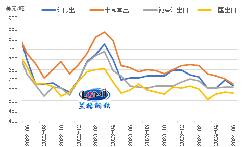 目前我國鋼材出口報價優勢仍存,但空間繼續收窄。蘭格鋼鐵研究中心監測數據顯示,截至2024年6月6日,印度、土耳其、獨聯體熱軋卷板出口報價(FOB)分別為573美元/噸、580美元/噸和565美元/噸,中國熱軋卷板出口報價(FOB)為535美元/噸;目前我國熱卷出口報價分別較印度、土耳其、獨聯體熱卷出口報價低38美元/噸、45美元/噸和30美元/噸(詳見圖4)。