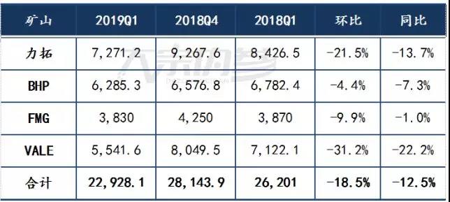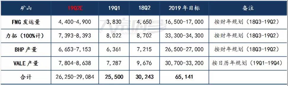 四大礦山鐵礦石生產計劃及2019年2季度預測(單位:萬噸)